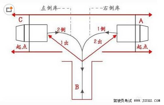 先从“A”经过“1倒”进入“B”,从“B”出来经过“1出”进入“C”,再从“C”经过“2倒”进入“B”,最后从“B”经过“2出”进入“A”考试结束。
