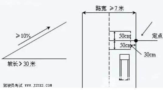坡道定点停车和起步是驾驶员考试中的一个考核点。考试要求:要求在≥10%坡,≥30米坡长的坡道上的固定位置停车,考察方向、制动、离合器三者的协调配合。目的是为了培养机动车驾驶人准确判断车辆的位置,正确使用制动、档位和离合器,以适应在上坡路段停车与起步需要。